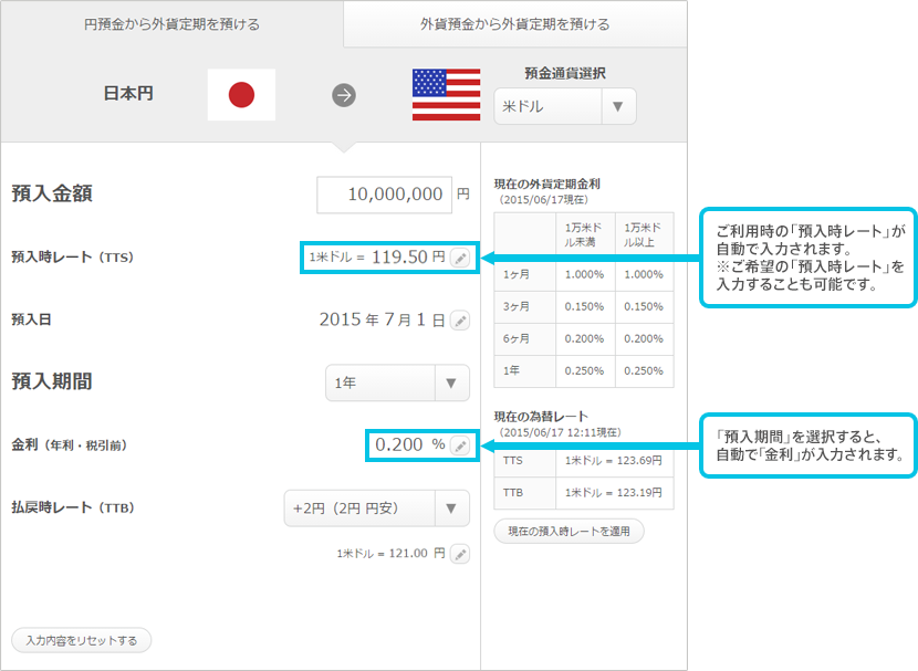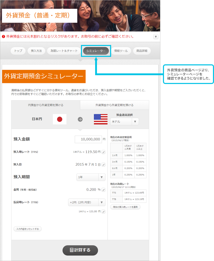2015年7月3日(金)、スマートフォンとパソコンでご利用いただける「外貨定期預金シミュレーター」をリニューアルいたしました。