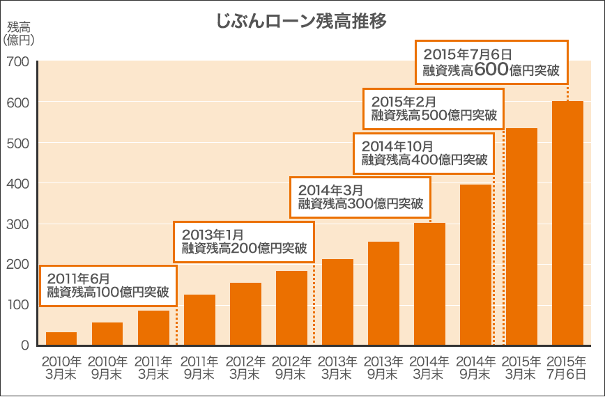 じぶんローンは、2008年12月にサービスを開始し、2015年2月には500億円を突破しました。それから5か月弱での融資残高600億円突破となりました。