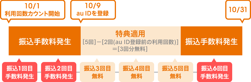 au ID登録月の振込手数料無料回数は、「5回」から「au ID登録前の振込利用回数」を差引いた回数となります。