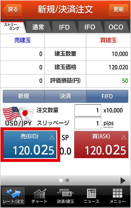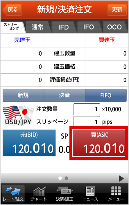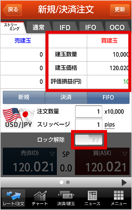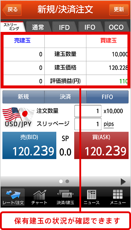 ストリーミング注文画面に[建玉数量][建玉価格][評価損益]を表示。保有建玉の状況を一目で確認できます。 また、発注ボタンの為替レートを大きく表示させ、操作性がアップいたしました。