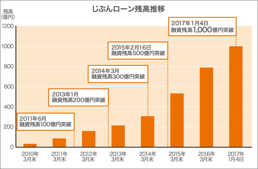 じぶんローンは、2008年12月にサービスを開始し、2014年3月に融資残高300億円、その11か月後の2015年2月に融資残高500億円突破。それから1年11か月後での融資残高1,000億円突破となりました。