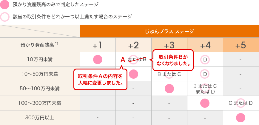 預かり資産残高10万円未満のお客さまが「じぶんプラス2」となるための取引条件について、現在の取引条件Aの内容が大幅に変更となり、取引条件Bがなくなりました。