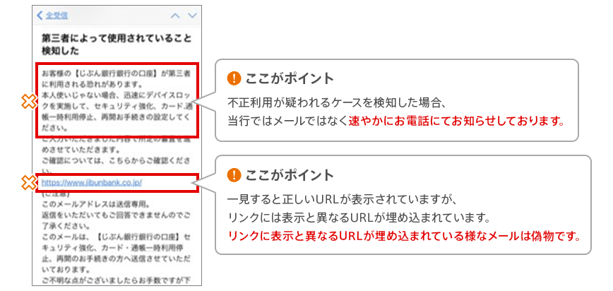 - ①当行を装い不正利用の検知やセキュリティ強化の名目でメールが届く