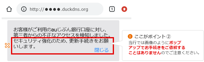 - ②SMS記載のリンクを開くと、当行を装った不正アクセスを検知した旨のポップアップが表示される