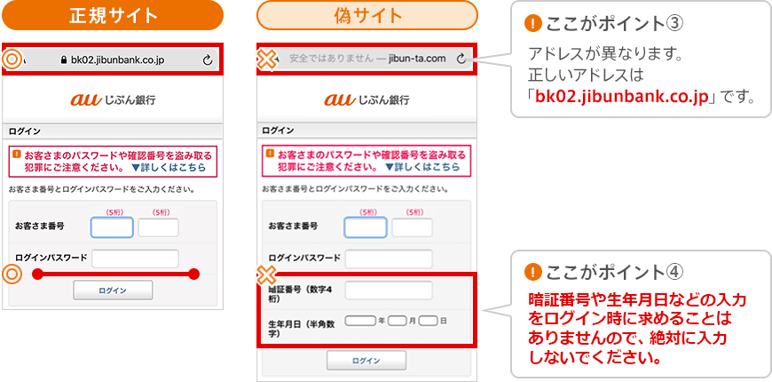 - ④万が一、不審なサイト等でパスワード等を入力してしまった場合は、直ちにauじぶん銀行お客さまセンターまでご連絡ください。