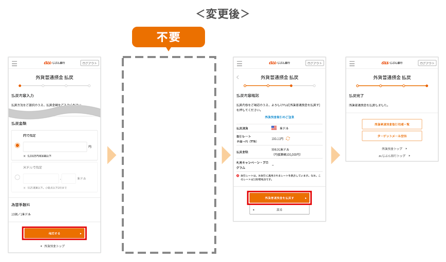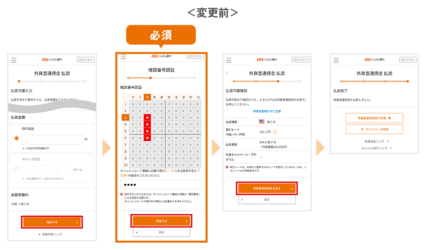 この度、お客さまからのご要望をふまえた機能変更を行いましたのでお知らせいたします。外貨普通預金から円普通預金へ払戻時、キャッシュカード裏面の確認番号を入力する認証が必須でしたが、今回の機能変更にて確認番号認証が不要となりました。