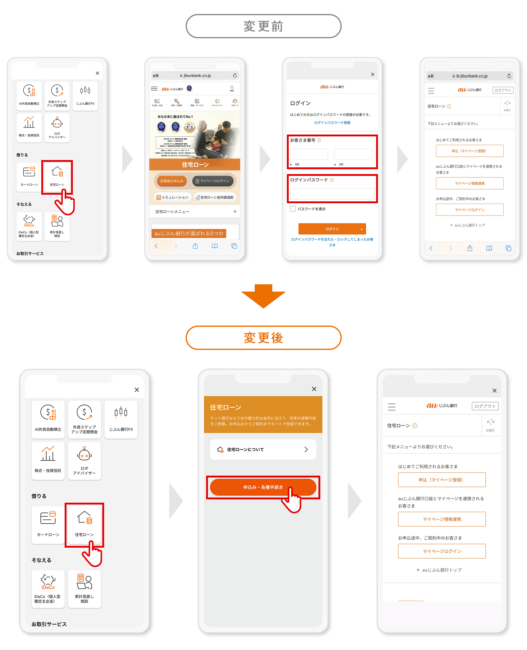 • 住宅ローンお申込み後にauじぶん銀行口座を開設されたお客さまは、アプリから住宅ローンマイページにログインするには「住宅ローンマイページ情報連携」のお手続きが必要となります。