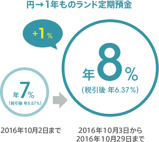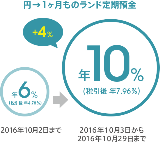 ![[期間限定で南アフリカランドの金利が高い!] 特典1:円からのお預入れで1ヶ月ものランド定期預金 年10%(税引後 年7.96%)、特典2:円からのお預入時の為替手数料が50%OFF!対象期間:2016年10月3日(月)~2016年10月29日(土)。](./img/h1_01_pc.png)