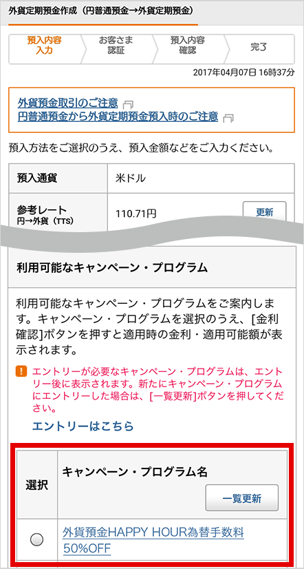 お取引時の画面の下部に表示される[利用可能なキャンペーン・プログラム]にて【外貨預金HAPPY HOUR 為替手数料50%OFF】を選択してください。