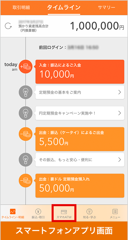 スマートフォンアプリにログインし、[スマホATM]を選択