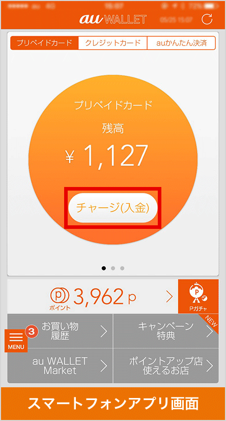 「au WALLET アプリ」を起動し、トップ画面から[チャージ(入金)]を押す