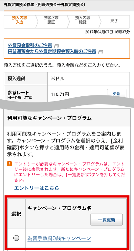 • お取引時に表示される[利用可能なキャンペーン・プログラム]にて【為替手数料0銭キャンペーン】を選択したお客さまが当キャンペーンの対象となります。当キャンペーン以外を選択した場合は、当キャンペーン特典の対象外となりますのでご注意ください。