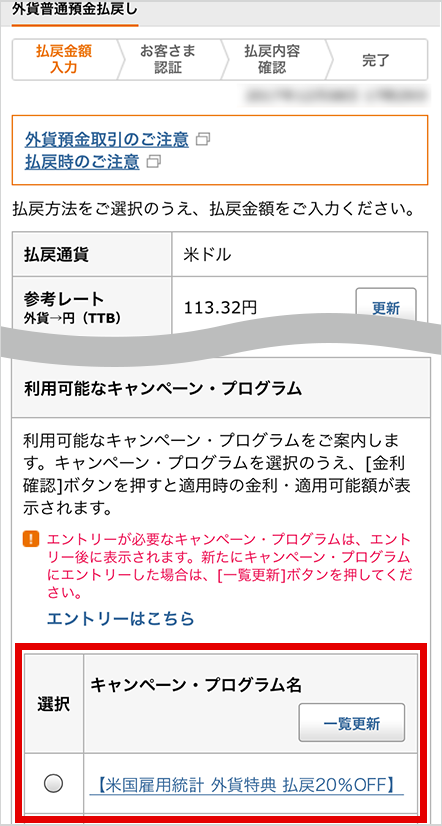 お取引時の画面の下部に表示される[利用可能なキャンペーン・プログラム]にて【米国雇用統計 外貨特典(払戻20%OFF)】を選択してください。