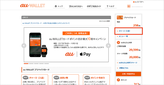 じぶん銀行円普通預金口座から「au WALLET プリペイドカード」へのチャージ(入金)は、KDDIが提供するau WALLET サイトからご利用いただけます。