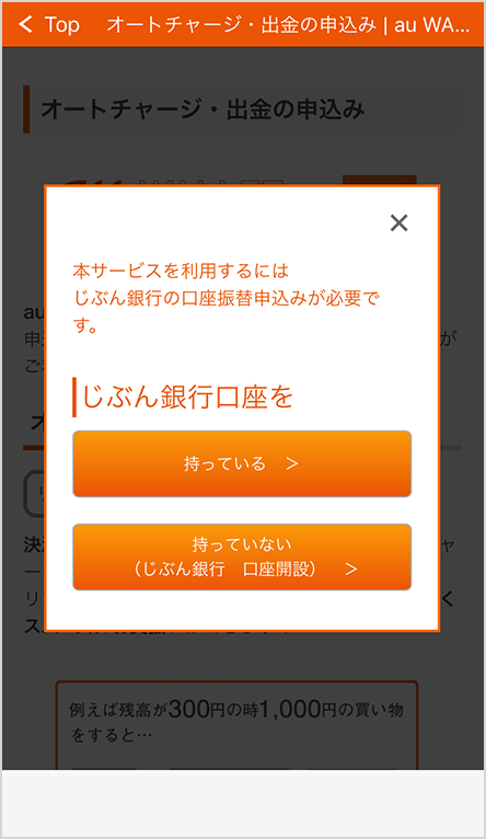 - au WALLET アプリまたはスマートフォン版au WALLETサイトから、じぶん銀行口座からのオートチャージをご利用いただいた場合のみ、キャンペーンの対象となります。au かんたん決済でのお支払いやau料金のお支払いがじぶん銀行であっても対象外です。