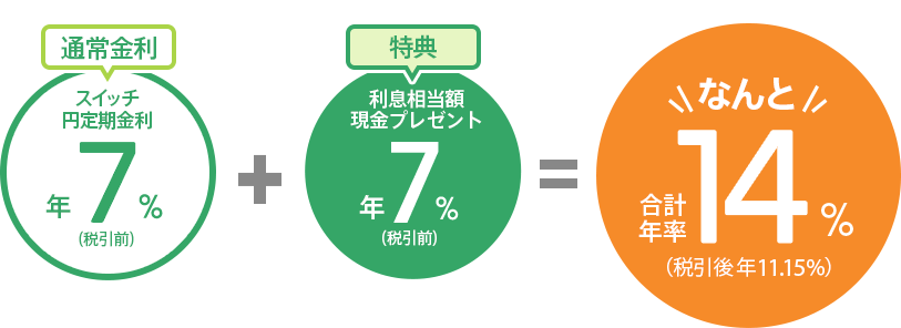 絶対もらえる通常金利 スイッチ円定期金利 年7.0%(税引前)+さらに、取引明細番号の下2桁目が「7」なら、利息相当額現金プレゼント