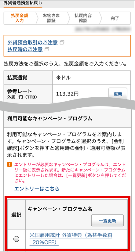 お取引時に表示される[利用可能なキャンペーン・プログラム]にて【米国雇用統計 外貨特典(為替手数料20%OFF)】を選択いただくと、お預入時は同時開催の「為替手数料引下げキャンペーン」 の引下げ後手数料からさらに20%OFFになります。
