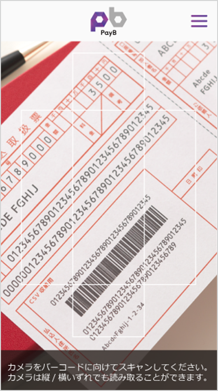 アプリを起動し、スマートフォンのカメラで払込票に記載されたバーコードを読み取り、お支払い内容確認のうえPayBパスワードを入力するとお支払いが完了します。