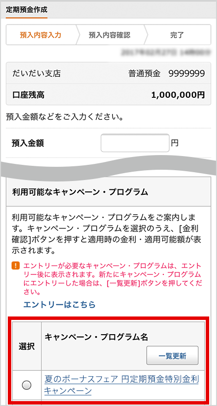 円定期預金作成時の画面の下部に表示される[利用可能なキャンペーン・プログラム]にて、【夏のボーナスフェア 円定期預金特別金利キャンペーン】を選択してください。