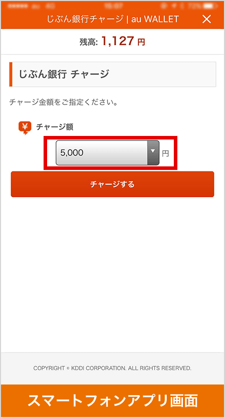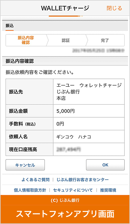 確認画面にてチャージ金額を確認のうえ、じぶん銀行口座からの決済手続きを行い、チャージ完了!