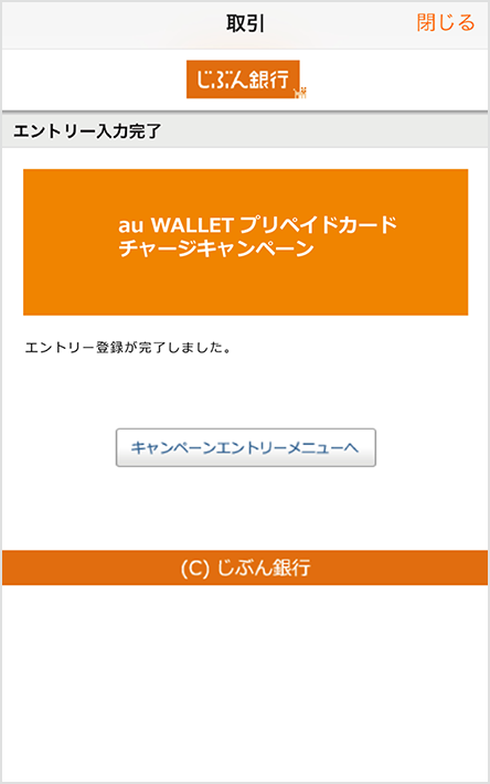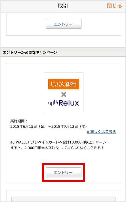 「au WALLET プリペイドカードチャージキャンペーン」を選んで、エントリーボタンを押す