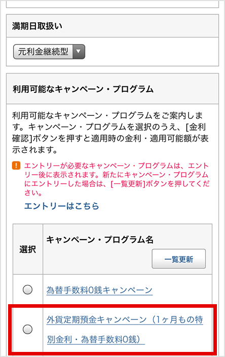 【外貨定期預金キャンペーン(1ヶ月もの特別金利・為替手数料0銭)】を選択