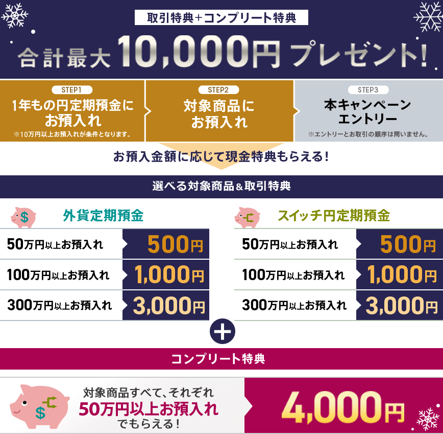対象商品である「外貨預金」「スイッチ円定期預金」には元本割れとなるリスクがあります。各商品の重要事項を必ずご確認ください。
