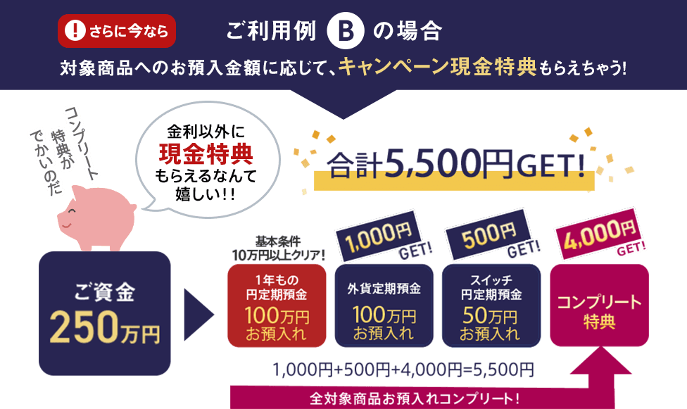 - 期間中に合計50万円以上、スイッチ円定期預金のお預入れが成立すること →申込方法