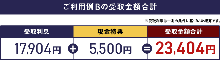 - ※本計算例は、以下条件でお預入れいただいた場合のシミュレーションであり、実際の取引条件・投資成果等を保証するものではありません。お取引の際は必ず最新金利一覧をご確認ください。