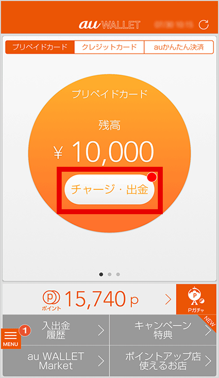 「au WALLET アプリ」を起動し、トップ画面から[チャージ・出金]を押す