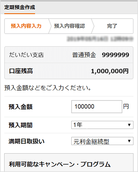 - お取引時に表示される[利用可能なキャンペーン・プログラム]にて【夏の特別金利と最大10万円キャンペーン(1年もの円定期預金)】を選択いただくこと。
