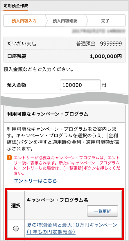 - お取引時に表示される[利用可能なキャンペーン・プログラム]にて【夏の特別金利と最大10万円キャンペーン(1年もの円定期預金)】を選択してください。