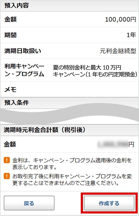 [満期日取扱い]の下の[利用可能なキャンペーン・プログラム]にて、【夏の特別金利と最大10万円キャンペーン(1年もの円定期預金)】を選択