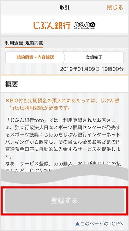 - *「toto約款に同意する」をチェックする際は、事前に「toto約款」リンクより内容をご確認いただく必要がございます。また、「じぶん銀行toto利用にかかる規約に同意する」をチェックする際も事前に「じぶん銀行toto利用にかかる規約(PDF)」リンクより内容をご確認いただく必要がございます。