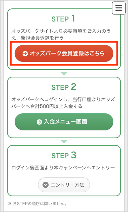 「【オッズパーク】簡単!会員登録&500円入金で現金プレゼント!」を選んで、エントリーボタンを押す。