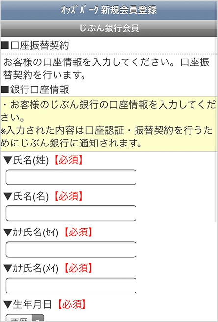 じぶん銀行口座を指定したオッズパークの新規会員登録と、