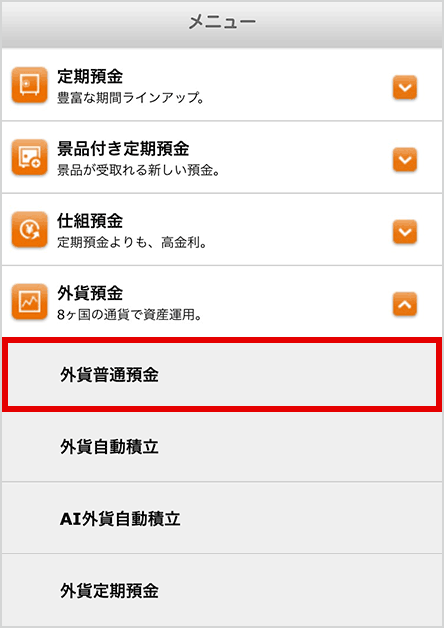 [外貨普通預金口座開設]を選択(8通貨の口座が一括で開設できます)