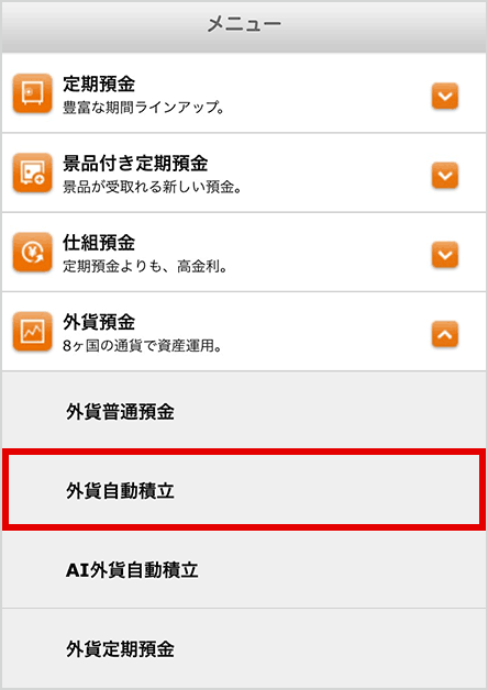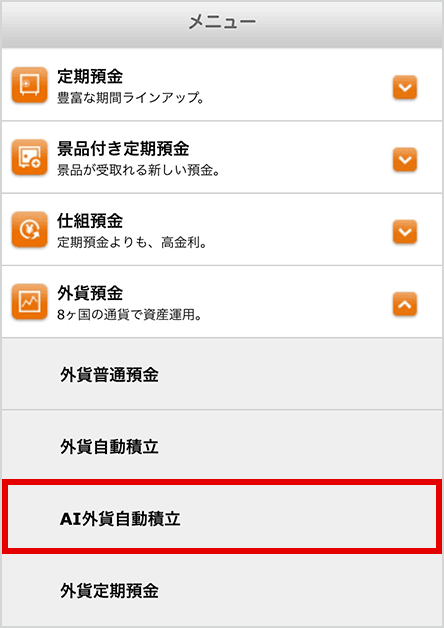 ログイン後、メニューから「AI外貨自動積立」を選択