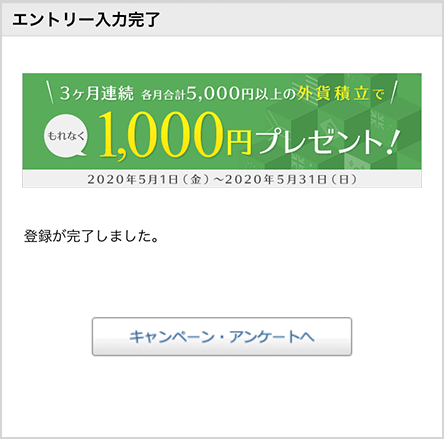 期間中に、外貨自動積立、あるいはAI外貨自動積立に新規でお申込みいただき、 2020年6月から8月の3ヶ月連続で、各月合計5,000円以上の積立をしたお客さまに、現金1,000円をプレゼントいたします。