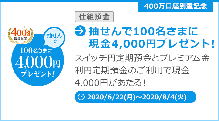 - 特典の入金時点で円普通預金口座が解約されているなど、入金ができない場合は本キャンペーンの対象外となります。