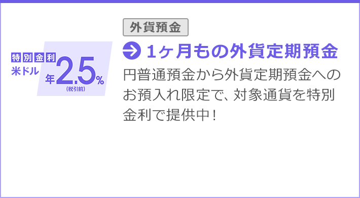 - 詳しくは、外貨預金の詳細および契約締結前交付書面を必ずご確認いただき、お取引ください。