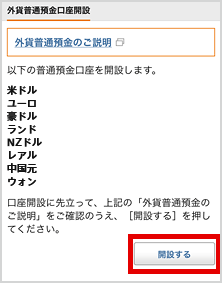 [外貨普通預金口座開設]を選択(8通貨の口座が一括で開設できます)