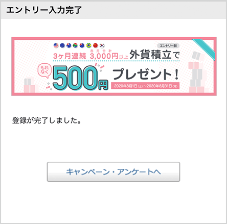 期間中に、外貨自動積立、あるいはAI外貨自動積立に新規でお申込みいただき、 2020年9月から11月の3ヶ月連続で、各月合計3,000円以上の積立をしたお客さまに、現金500円をプレゼントいたします。