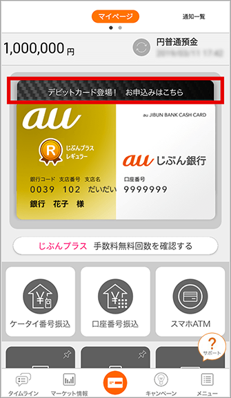 じぶん銀行アプリ内マイページの「お申込みはこちら」をタップ