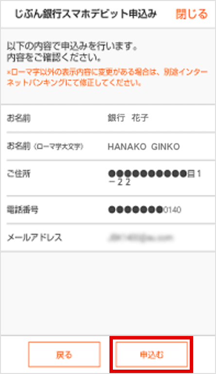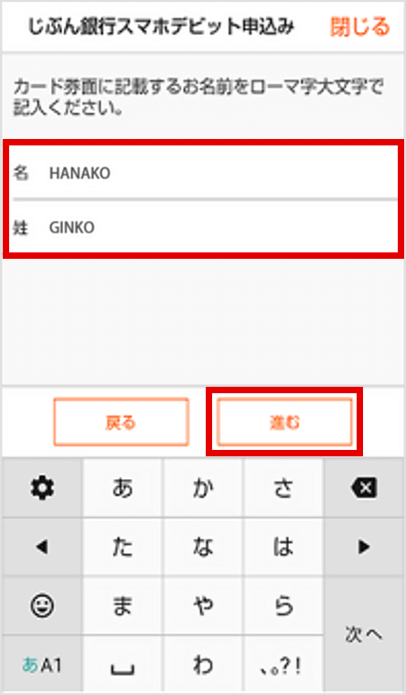 じぶん銀行アプリ上のカード券面に表示するお名前をローマ字大文字で入力