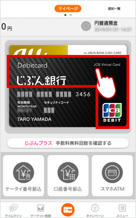 スマホデビット券面の赤枠で示したエリアをタップしてメニューを表示