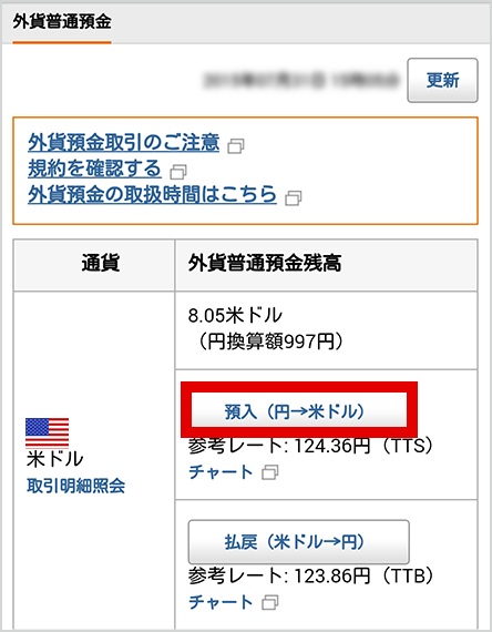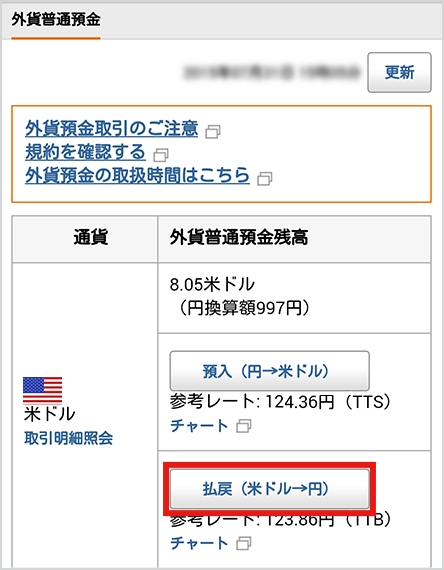 期間中、米ドル普通預金から円普通預金へ払戻しを行うこと。