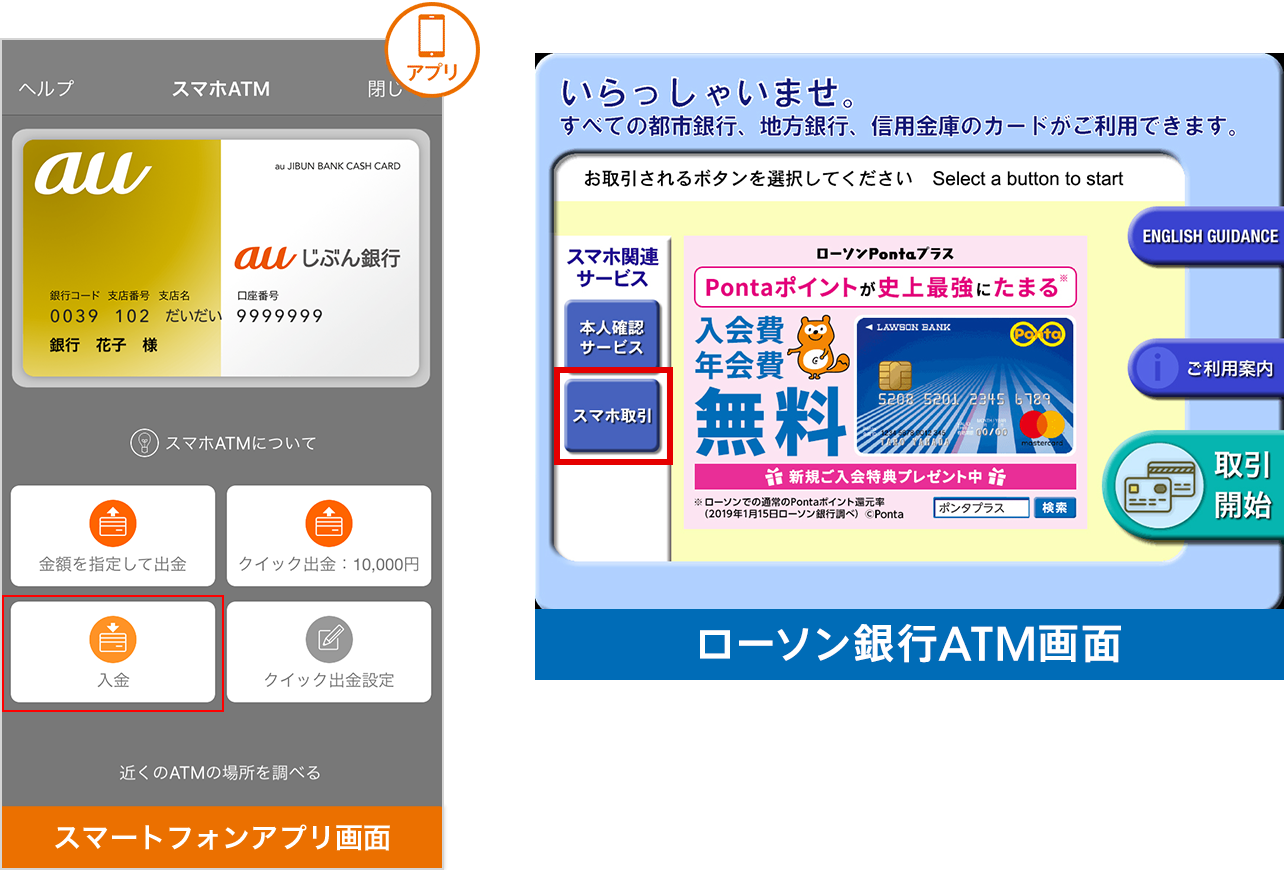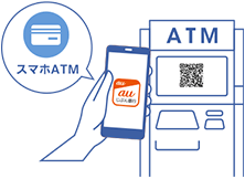 auじぶん銀行のスマホATMを利用し、ローソン銀行ATM*にて「入金」または「出金」のお取引を行ってください。