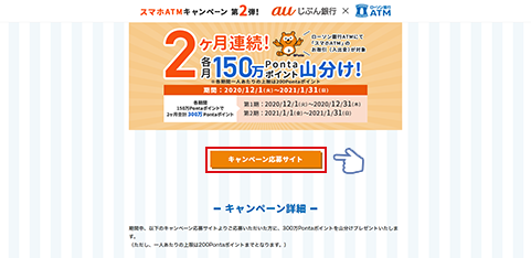 期間中、対象となるお取引をいただき、ローソン銀行のキャンペーン応募サイトよりご応募いただいた方に、各期間150万Pontaポイントを山分けプレゼントいたします。