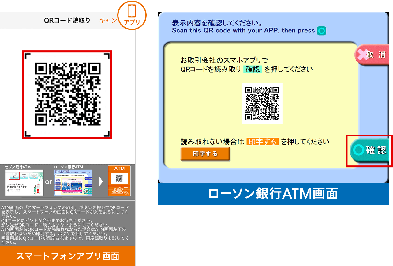 ATM画面に表示されるQRコードをアプリで読取り、ATM画面の[確認]を選択